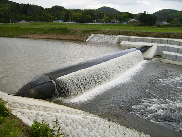 ゴム製板を袋状にして、その中に風船のように空気を入れてふくらませることによって水を堰き止め、用水路にかんがい用水を取り入れます。