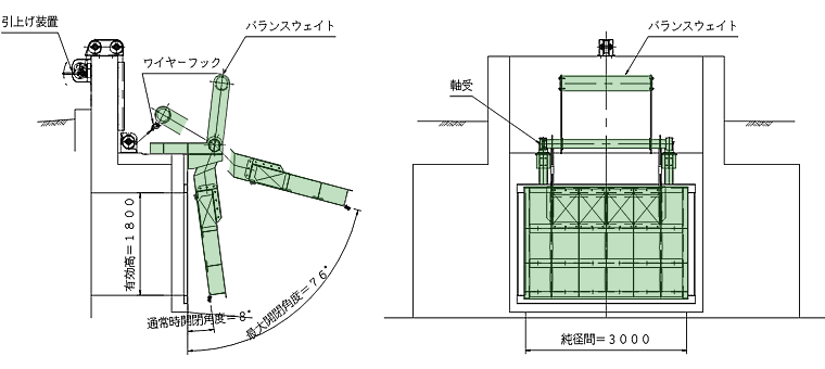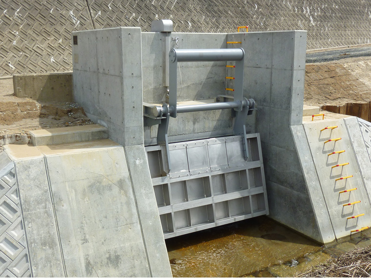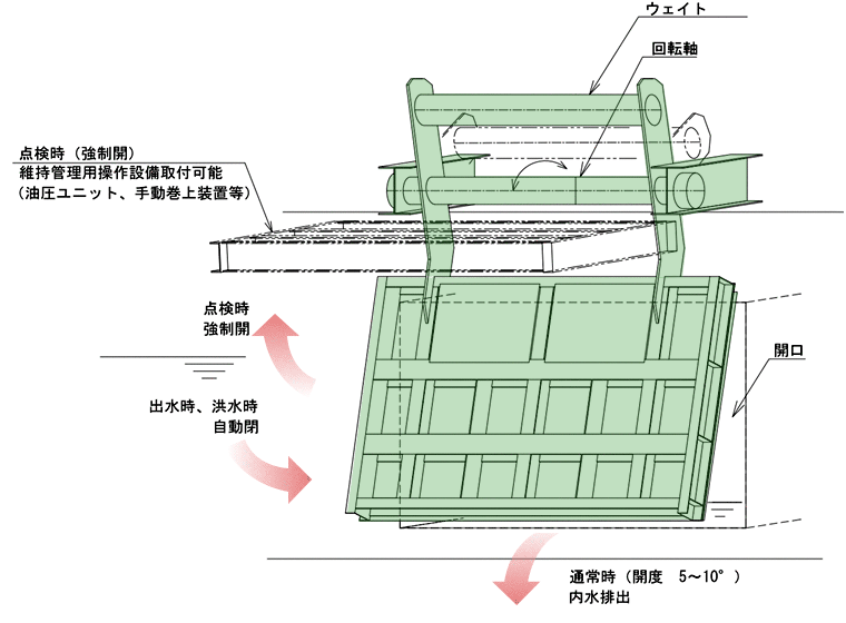 動力設備が不要な自動開閉式ゲートです。通常時は5 〜 10°で内水を排水、出水時、洪水時にはウエイトで自動閉門。操作の無人化を実現し、維持管理操作設備も設置可能。構造物が上に出ず、景観も害しません。